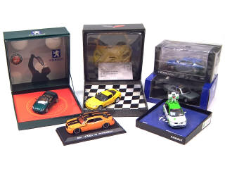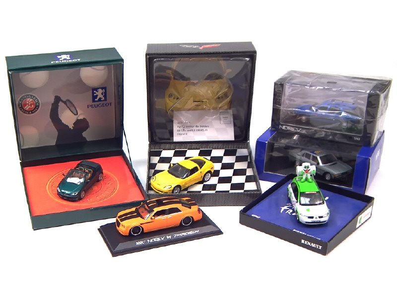comprend : RENAULT 21 NEVADA 'EDF', MEGANE 'ANTARGAZ' (voiture de la caravane du Tour de France), PEUGEOT 604 'CLUB 604 INTERNATIONAL' (série limitée numérotée 147/150 exemplaires), 206 CC 'ROLAND GARROS', CHEVROLET CORVETTE (manque un rétroviseur) & CHRYSLER 300C