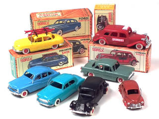 rééditions - comprend : CITROEN TRACTION (2 exemplaires différents dont un de production originale en état 'C.-' avec manques), PANHARD DYNA, RENAULT 4 CV, FREGATE AMIRAL (avec boîte non conforme), FORD VEDETTE (pare-chocs avant décollé) & SIMCA TRIANON (sans boîte)