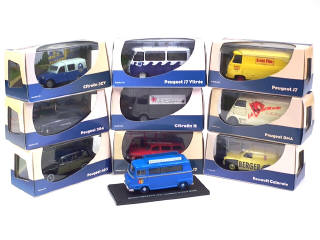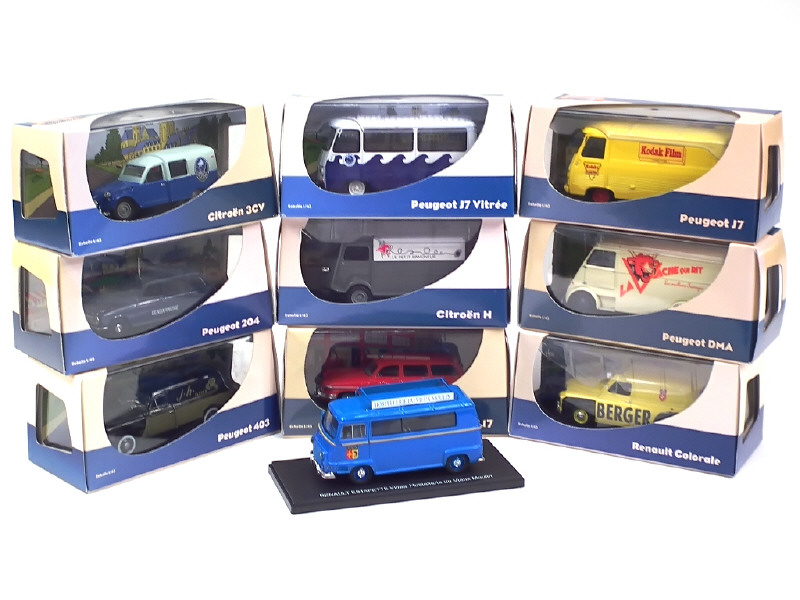 collection 'LES PETITS UTILITAIRES FRANCAIS' - comprend : RENAULT ESTAFETTE minibus, COLORALE 'BERGER', PEUGEOT DMA 'VACHE SUI RIT', J7 'LA BALEINE', 'KODAK', 204 break 'GENDARMERIE', 403 fourgonnette 'JH FLEURS', CITROEN 3CV 'POTASSE D'ALSACE', 1200 kg 'LE PETIT RAMONEUR' & PANHARD PL 17 pompiers
