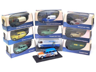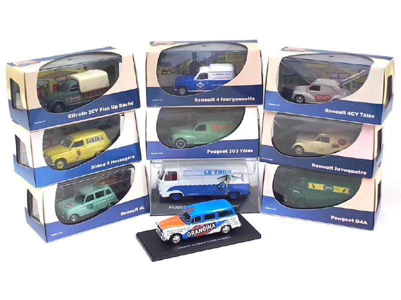 collection 'LES PETITS UTILITAIRES FRANCAIS' - comprend : PEUGEOT 203 'SINGER', 403 'ORANGINA', D4A 'PERRIER', RENAULT 4CV 'BIC', 4L 'CHICOREE LEROUX', JUVA 4 'BALLY', 4 fourgonnette 'CAMPING GAZ', CITROEN 2CV pick-up baché 'DUBOIS' & SIMCA 9 'BANANIA' - on y joint un PEUGEOT J7 rallongé 'LE THON C'EST BON' d'une autre collection