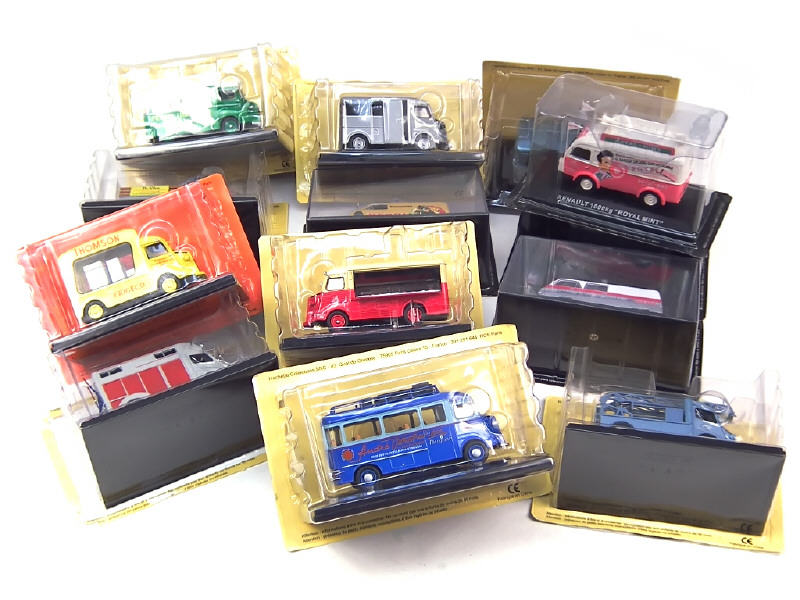 modèles vendus en kiosque - miniatures reproduisant les modèles : CITROEN 1200 kg (9 exemplaires différents), RENAULT 1000 kg, DKW (2 exemplaires différents) & PEUGEOT J5 - on y retrouve notamment la marque EDITIONS HACHETTE - 2 boîtes incomplètes