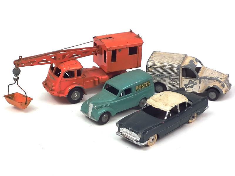 états de 'D' à 'E' - comprend : CITROEN 2CV fourgonnette 'TCF', RENAULT 120 CV grue, 300 KG 'POSTES' & SIMCA VEDETTE - on y retrouve les marques : JRD (une roue remplacée), CIJ & QUIRALU - petits manques