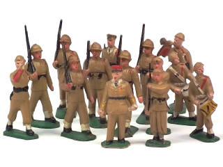 réalisation en plastique - comprend : 6 figurines avec fusil sur l'épaule, 2 au 'présentez arme', 2 clairons, 2 tambours & 2 officiers - 2 petits manques