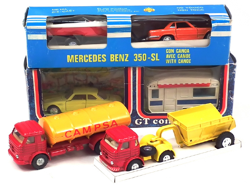 différentes échelles - comprend : PEGASO citerne 'CAMPSA', remorque benne basculante, MERCEDES 350 SL & ISO RIVOLTA coupé GT