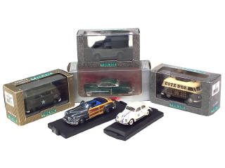 comprend : CADILLAC 62, CHRYSLER TOWN & COUNTRY, VOLKSWAGEN COMBI 'US ARMY' (édition limitée), 'COTE D'OR' (avec certificat d'édition limitée numéroté 124/250 exemplaires), VOLKSWAGEN COCCINELLE fourgon de la WEHRMACHT & 1200 HERBIE (édition limitée)