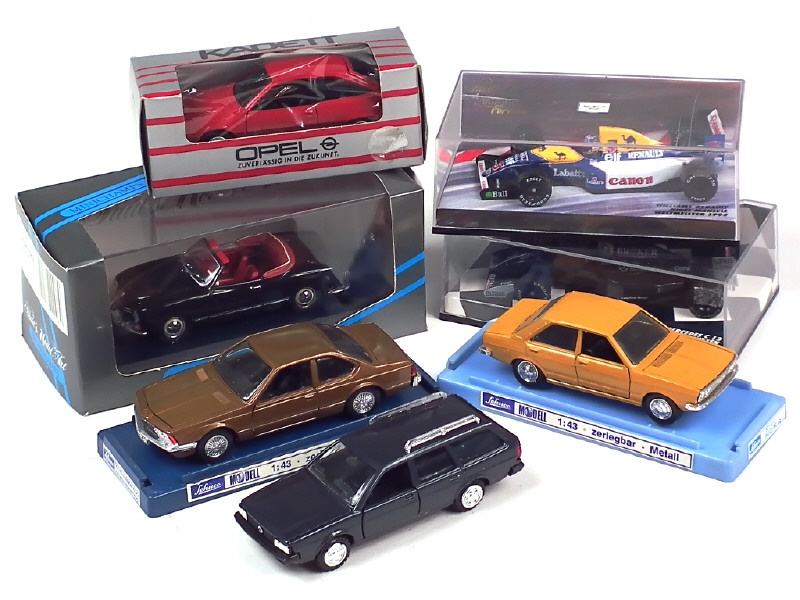 comprend : BMW 630, VOLKSWAGEN PASSAT VARIANT, KARMANN GHIA cabriolet, AUDI 80 LS, OPEL KADETT, WILLIAMS RENAULT F1 & SAUBER MERCEDES C13 F1 - on y retrouve notamment les marques : MINICHAMPS (2 boîtes fêlées), CONRAD, SCHUCO & GAMA