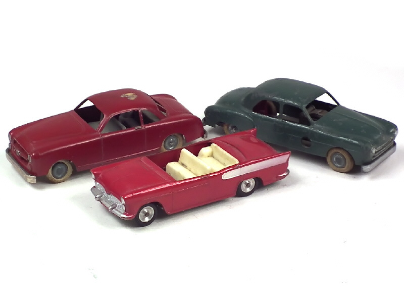 séries démontables - comprend : SIMCA BEAULIEU (manque partie vitrée), FORD COMETE (moteur à clef fonctionne, un important manque de peinture sur le toit) & RENAULT FREGATE (en état 'E', moteur à clef fonctionne, une banquette manquante) - pneus plus ou moins séchés & endommagés