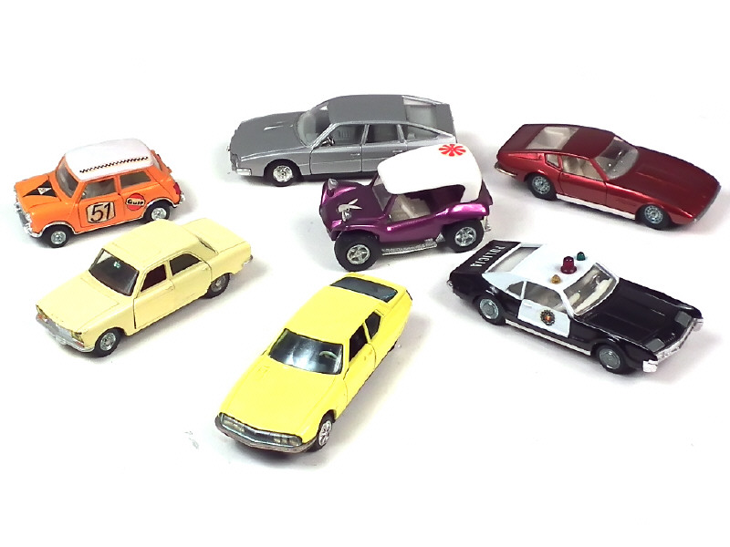 comprend : MASERATI GHIBLI, OLDSMOBILE TORONADO 'POLICIA', MINI COOPER, BUGGI PLAYERO (importantes traces de métal fatigue avec déformations sur le plancher) & PEUGEOT 304 (état 'B' avec éclats plus ou moins importants) - on y joint une CITROEN CX 2400 PALLAS (de la marque MIRA) & SM del a marque JOAL