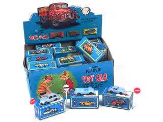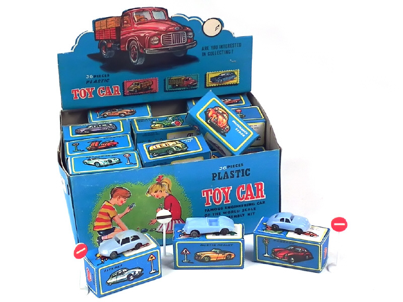 petite échelle - réalisation en plastique - contient notamment : CITROEN DS 19, PORSCHE 356, VOLKSWAGEN COCCINELLE, AUSTIN HEALEY, rouleau compresseur, JAGUAR XK 120, dépanneuse, scooter ... - chaque modèle est en boîte individuelle dont certains avec un panneau de signalisation - légères traces de colle d'origine sur quelques exemplaires - possibilité de petis accessoires manquants - la surboîte est en état 'b'