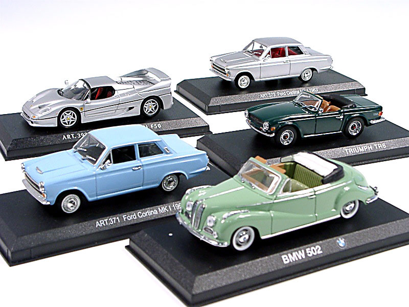 miniatures reproduisant les marques : TRIUMPH, FERRARI, BMW & FORD - avec 4 suremballages en carton