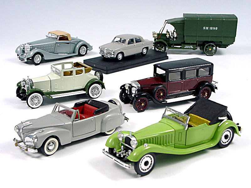 miniatures reproduisant les marques : ALFA ROMEO, FIAT, ROLLS-ROYCE, LINCOLN, BENTLEY & BUGATTI - manque une mascotte de radiateur sur l'un des modèles & une sangle de capote coupée - un modèle avec boîte