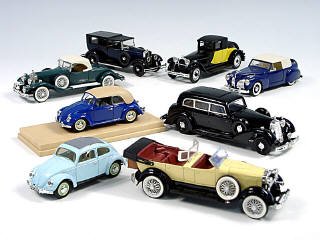 miniatures reproduisant les marques : VOLKSWAGEN, ROLLS-ROYCE, LINCOLN, BUGATTI, ISOTTA FRASCHINI & MERCEDES - un modèle en état 'C' avec le capot moteur en métal fatigue - un modèle avec boîte