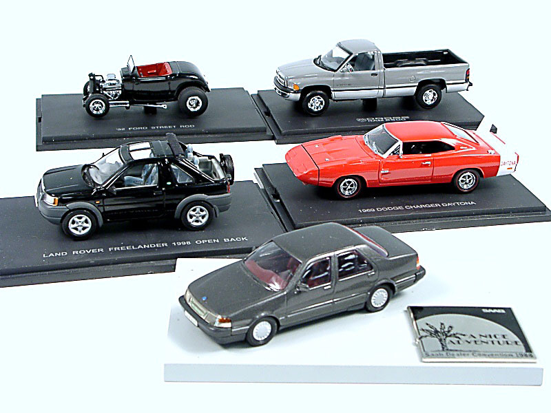 miniatures reproduisant les marques : LAND ROVER, DODGE, FORD & SAAB - la SAAB est de marque 'SOMERVILLE' réalisée pour la convention des vendeurs SAAB de 1988