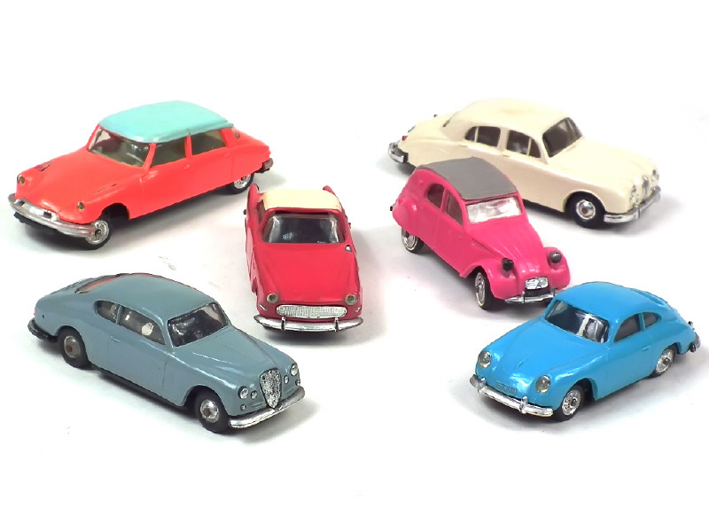 comprend : LANCIA AURELIA, JAUGUAR 2.4L, CITROEN DS 19, 2CV, SIMCA PLEIN CIEL (manque antenne) & PORSCHE 1500 - petites déformations des carrosseries avec jantes légèrement fondues