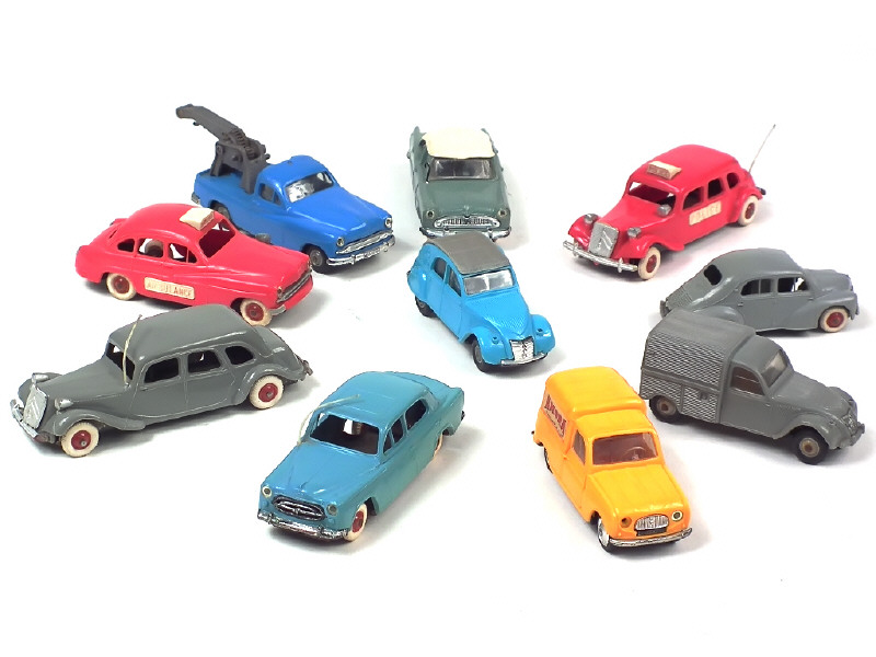 comprend : FORD VEDETTE dépanneuse, ambulance, PEUGEOT 403, SIMCA VERSAILLES, CITROEN TRACTION 'POLICE', familiale, 2CV (2 exemplaires différents), RENAULT 4 fourgonnette 'AMORA' & 4CV - carrosseries plus ou moins déformées, décolorées avec jantes légèrement fondues - nombreux manques avec traces d'oxydation sur les planchers & parties cassées
