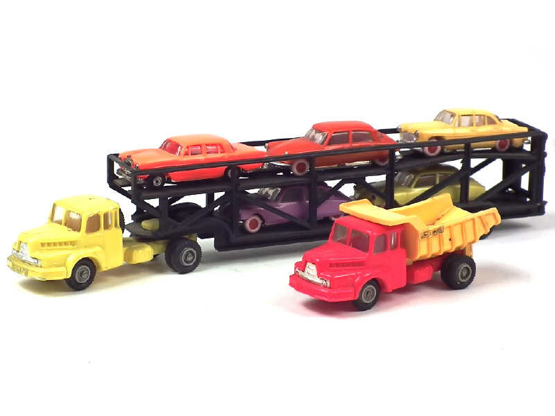 série 'MICROMINIATURES' - comprend : UNIC ZU120 semi-remorque transport de voitures, benne carrière, MERCEDES 220 SE, SIMCA VERSAILLES & CITROEN DS 19 (3 exemplaires différents) - légères déformations des carrosseries