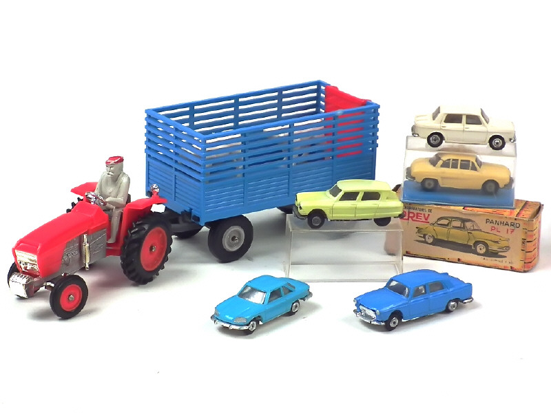 série 'MICROMINIATURES' - comprend : PANHARD 24CT, PL17, SIMCA 1000, PEUGEOT 404, RENAULT DAUPHINE (état 'C' avec un montant de toit cassé) & CITROEN AMI 6 (état 'C') - 4 voitures sans boîte & une autre avec boîte non conforme - on y joint un RENAULT R86 tracteur agricole avec remorque bétaillère (en état 'A-' sortie d'échappement incomplète) avec 2 veaux - quelques carrosseries plus ou moins décolorées