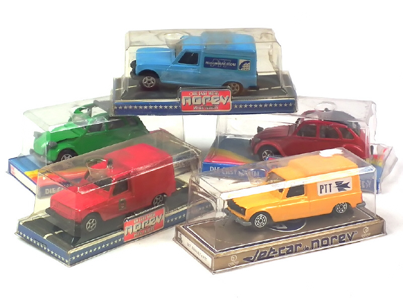 comprend : CITROEN 2CV (2 exemplaires différents) & RENAULT 4 fourgonnette (3 exemplaires différents) - une boîte en état 'd'