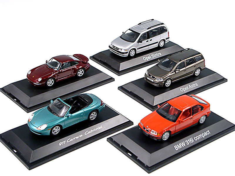 miniatures reproduisant les marques : PORSCHE, OPEL & BMW - avec 4 suremballages en carton