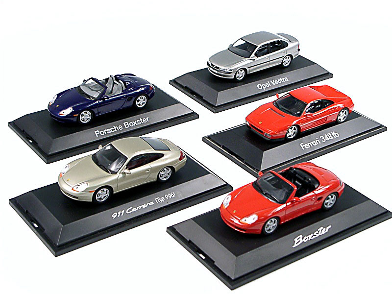 miniatures reproduisant les marques : PORSCHE, OPEL & FERRARI - 4 suremballages en carton