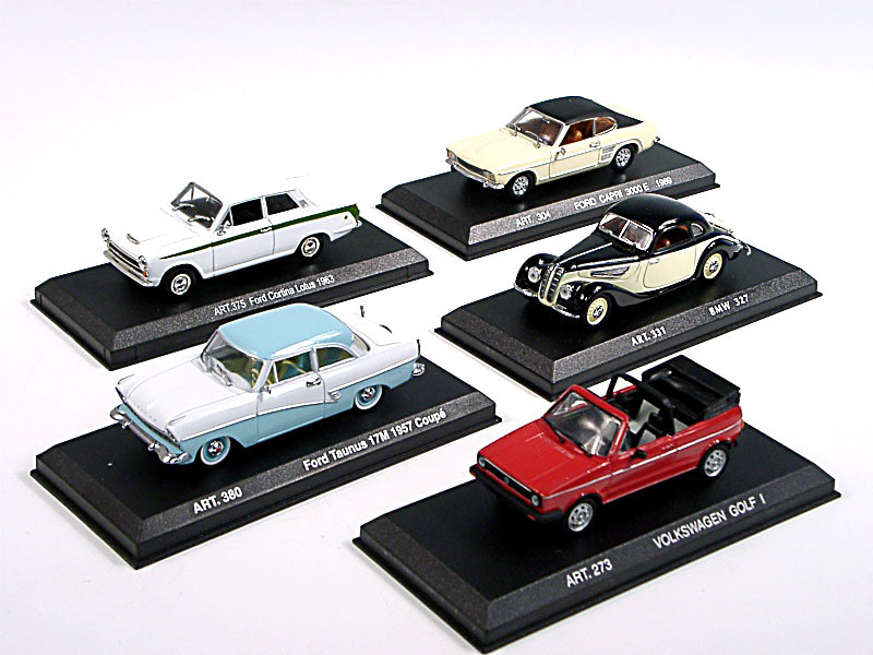 miniatures reproduisant les marques : FORD, BMW & VOLKSWAGEN - une petite retouche probablement d'usine sur l'aile arrière de l'un des modèles - avec 2 suremballages en carton