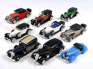 miniatures reproduisant les marques : PACKARD, RENAULT, PANHARD & LEVASSOR, CORD & BUGATTI - un modèle avec mascotte de radiateur cassée - un modèle avec boîte