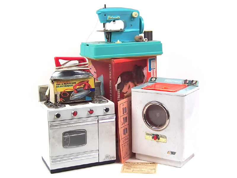 non testé - états de 'B' à 'D' - comprend : fer à repasser, machine à laver, machine à coudre & gazinière - on y retrouve notamment les marques : JEP, SIJAM & MACOUSETTE - boîtes en états de 'c' à 'd' - possibilité de petits accessoires manquants