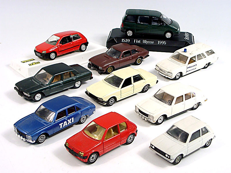 modèles reproduisant les marques : RENAULT, PEUGEOT, CITROËN & FIAT - 2 modèles avec boîte - un suremballage en carton - 4 modèles en état 'C' avec petits détails de peinture ajoutés