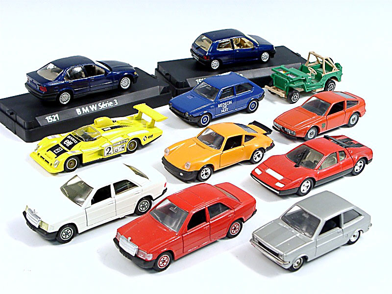 modèles reproduisant les marques : RENAULT, BMW, PORSCHE, JEEP, FERRARI, FORD, ALPINE, FIAT, MERCEDES & ALFA ROMEO - 2 modèles avec boîte - petits détails de peinture ajoutés sur 3 modèles - un modèle avec calandre incomplète