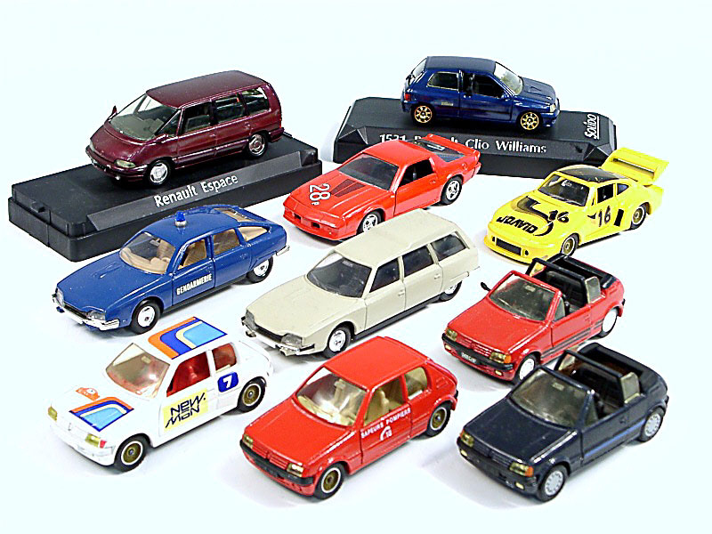 modèles reproduisant les marques : RENAULT, PORSCHE, PEUGEOT, CITROËN & CHEVROLET - 2 modèles avec boîte - petits détails de peinture ajoutés sur 4 modèles - manque un rétroviseur sur l'un des modèles
