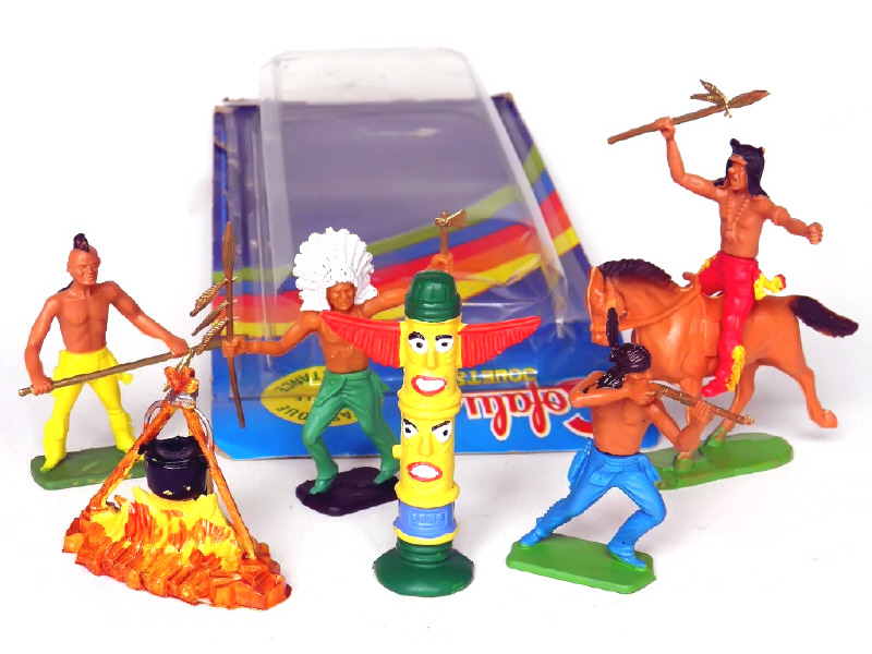 hauteur 7 cm - réalisationS en plastique - comprend : 4 indiens (avec bustes pivotants), un cheval, un totem & un feu de camp - accessoires signés CLAIRET