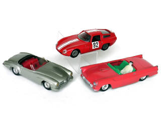 états de 'B' à 'D' - miniatures reproduisant les modèles : ALFA ROMEO, FORD THUNDERBIRD (manque pare-brise & volant) & MERCEDES (manque volant & conducteur)