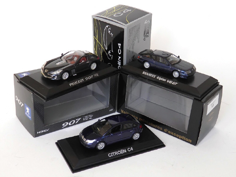 miniatures reproduisant les modèles : CITROEN C4, ALPINE V6 GT Turbo (étui CEC) & PEUGEOT 907