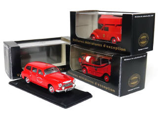 miniatures reproduisant les modèles : KZ, DOMAINE break (boîte non conforme) & JUVAQUATRE fourgonnette avec canot de sauvetage - étuis CEC