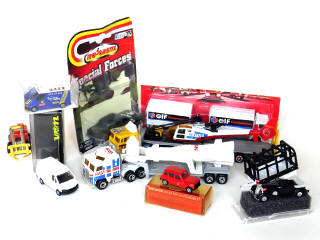 petites échelles - états de 'A' à 'B' - miniatures reproduisant les modèles : CHEVROLET, RENAULT, MACK, FORD, KENWORTH & HORCH - on y retrouve les marques : MAJORETTE, VEREM, RIETZE, HERPA, MATCHBOX (dont un chariot élévateur état 'R') & PRALINE
