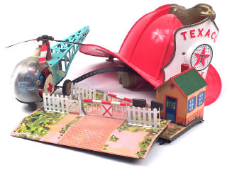 on y joint un hélicoptère de fabrication chinoise (état 'E' - longueur 35 cm - moteur à clef fonctionne - parties cassées & manquantes) & un casque de pompiers 'TEXACO FIRE CHIEF' avec micro (système à piles non testé)
