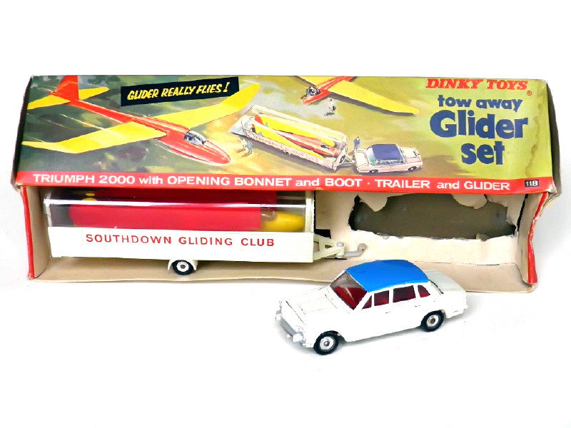 DINKY TOYS (GB) 118 TRIUMPH 2000 & Remorque avec planeur crème, toit bleu