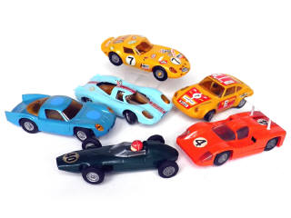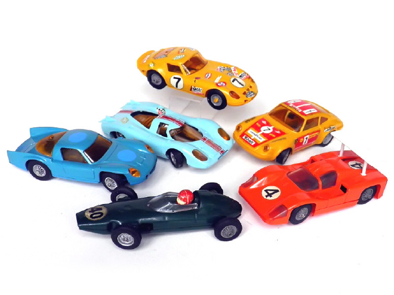 réalisations en plastique - états de 'A' à 'B' - miniatures reproduisant les modèles : PORSCHE, ALPINE, BRM, CHAPARRAL & FERRARI - moteurs non testés - 2 vitrages partiellement opacifiés