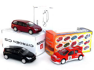 échelle 1/64ème - miniatures reproduisant les modèles : CITROEN C5 break, CITROEN C4 coupé & PEUGEOT 206 WRC - 2 PROMOTIONNELS pour CITROEN