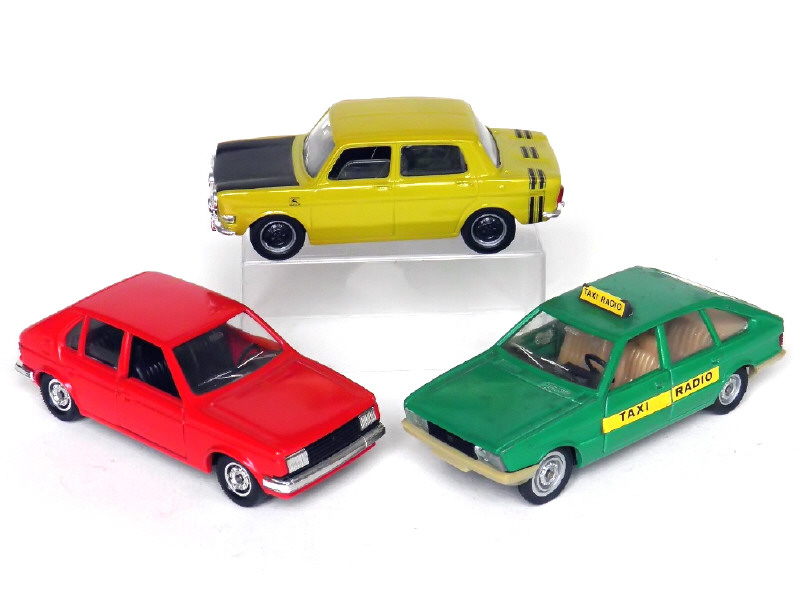 miniatures reproduisant les modèles : HORIZON, 1308GT taxi (défaut sur le pare-brise, 2 pneus non conformes) & 1000 RALLYE