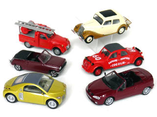 miniatures reproduisant les modèles : RENAULT CELTAQUATRE, RENAULT FIFTIE, RENAULT MEGANE cabriolet, RENAULT 5 cabriolet (transformation état 'R'), CITROEN 2CV pick-up & CITROEN 2CV bicéphale
