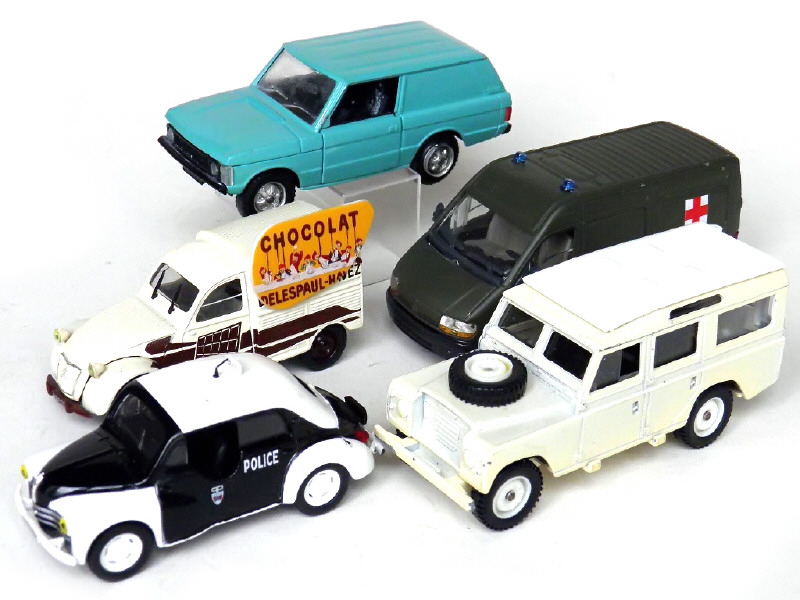 états de 'B' à 'F' - miniatures reproduisant les modèles : RENAULT 4CV, CITROEN 2CV fourgonnette, RENAULT Master, LAND ROVER & RANGE ROVER - on y retrouve les marques : NOREV & SOLIDO