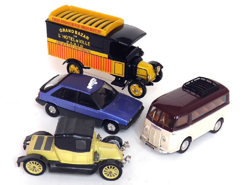 miniatures reproduisant les modèles : RENAULT 12/16 1910, RENAULT fourgon BHV, RENAULT 11 taxi & CHENARD minibus