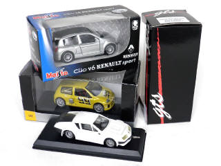 miniatures reproduisant les modèles : CLIO V6 sport, CLIO TROPHY & ALPINE A310 pack GT (manque un rétroviseur) - on y retrouve les marques : MAISTO, ONYX & GTS - une boîte non conforme