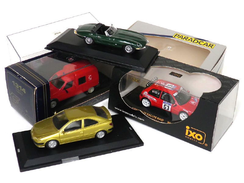 miniatures reproduisant les modèles : CITROEN C15 (manque un rétroviseur), CITROEN ZX rallye, CITROEN XSARA coupé & JAGUAR type E roadster (boîte non conforme) - on y retrouve les marques : ELIGOR, IXO, PARADCAR & DEL PRADO