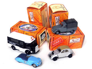 miniatures reproduisant les modèles : H 'POLICE', 2CV pick-up bâché, 2CV BARBOT spéciale & 2CV prototype TERRASSON - exlusivités pour HACHETTE
