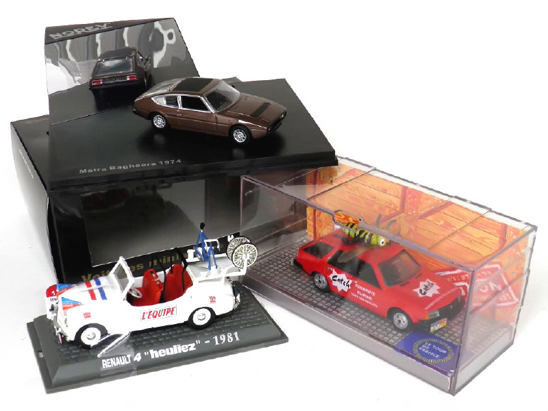 miniatures reproduisant les modèles : PEUGEOT 203 Tour de France (boîte non conforme), MATRA BAGHEERA 1974 (exclusivité CEC) & RENAULT 18 break 'CATCH' Tour de France