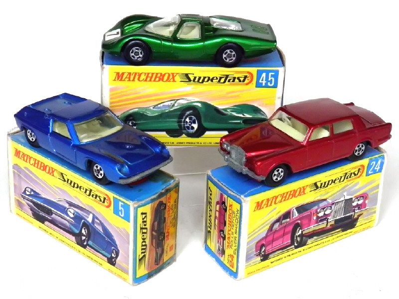 miniatures reproduisant les modèles : (MB5) LOTUS EUROPA, (MB24) ROLLS SILVER SHADOW & (MB45) FORD Group 6 - série 1-75