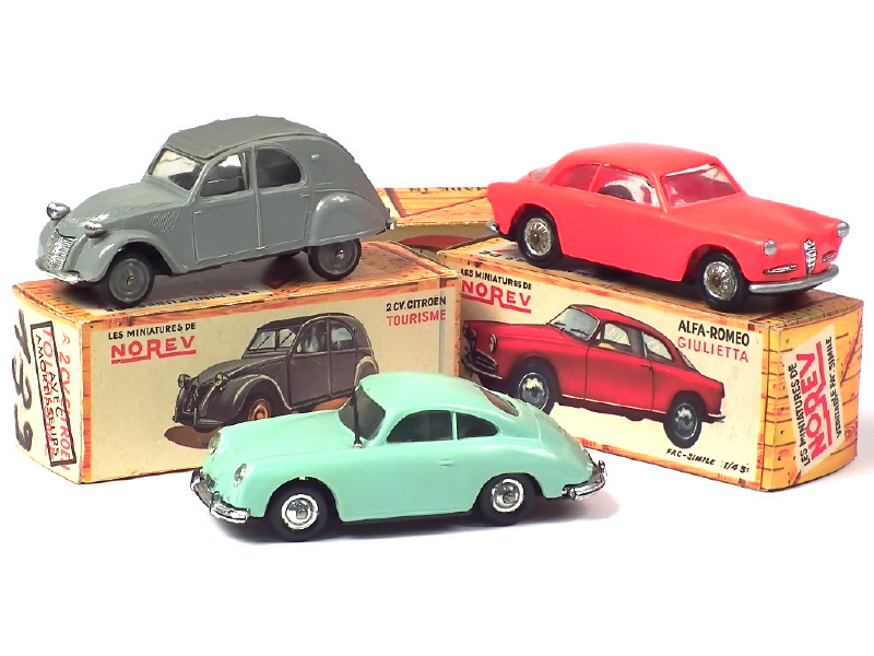 comprend : ALFA ROMEO GIULIETTA (pare-chocs fêlé & manque de peinture sur une jante), CITROEN 2CV (jantes très légèrement fondues & une annotation sur un rabat de boîte) & PORSCHE CARRERA (jantes légèrements fondues, manques de pellicule chromée sur l'antenne & une banane de pare-chocs cassée)