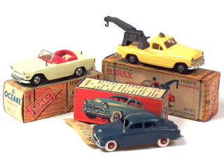 comprend : FORD VEDETTE dépanneuse, SIMCA ARRONDE 9 (boîte en état 'd' avec notice) & OCEANE (cercle de volant manquant - axes de roues oxydés) - jantes fondues